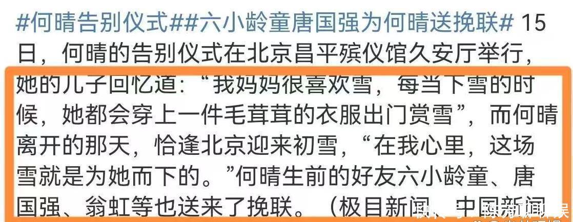 葬礼结束后,许何在告别仪式上追忆母亲的发言曝光。他提到:“我妈妈特爱雪,下雪时总会穿上毛茸茸的衣服出去赏雪。”13号何晴离世,北京正逢初雪,许何觉得这雪是为妈妈下的。
