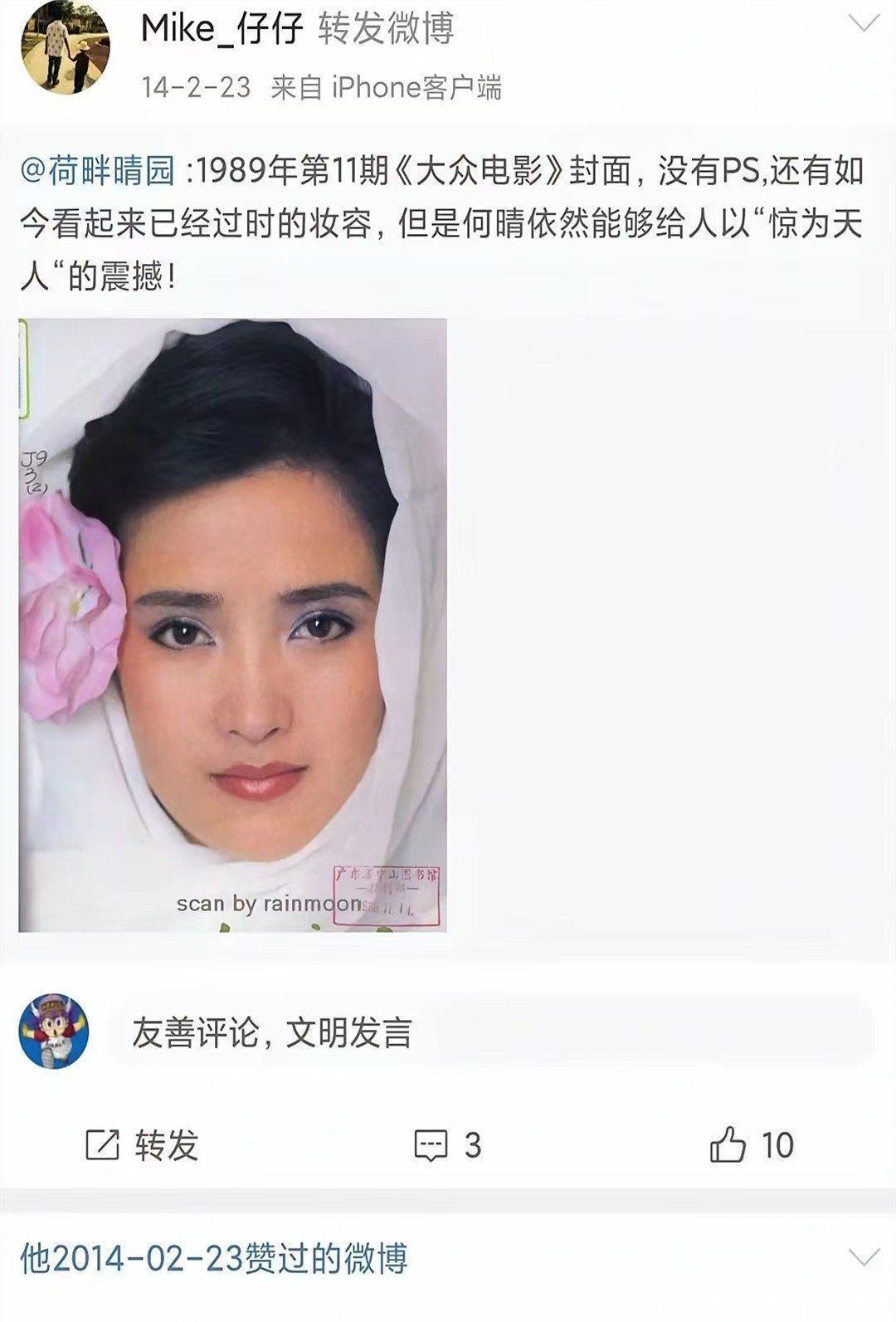 这是何晴年轻时一张披肩长发的照片,她右手托腮,这与 14 号其去世消息刚传出时,电影人余泳悼念所发的照片一致。这正是何晴颜值巅峰之际,也是她期望留给世间的模样。